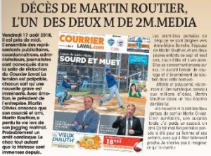 Neuf mois après s’être porté propriétaire du Courrier Laval avec son ami et associé Martin Olivier, notre vice-président Martin Routhier perdait la vie le 17 août 2018, foudroyé par un arrêt cardiaque lors de sa séance de jogging matinal. Affable et passionné, visionnaire à l’ère du numérique et jamais à court d’idées, Martin aura laissé sa marque et une empreinte indélébile au Courrier.