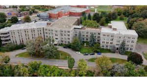 Photo aérienne du noviciat des Soeurs missionnaires de l’Immaculée-Conception. On aperçoit à l’arrière l’usine de production d’eau potable de Pont-Viau. Les 200 logements sociaux et abordables prévus au projet s’élèveraient sur le site derrière le bâtiment (120, place Juge-Desnoyers) situé à droite sur la photo. (Photo gracieuseté)