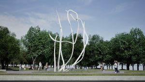 «Par ses formes longilignes, la sculpture évoque le mouvement du vent dans les plantes riveraines, mais ici, ce mouvement est représenté autrement : les tiges se courbent, ondulent et se balancent comme si elles étaient emportées par le vent», décrit l’artiste dans son document de présentation.