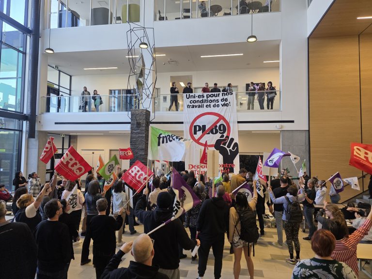 Des représentant.e.s syndicaux ont déroulé une imposante bannière où l’on pouvait lire Uni.es pour nos conditions de travail et de vie! Debout contre l’austérité!. Un symbole PL89 barré de rouge ainsi qu’un poing militant bien levé complétait l’étendard.