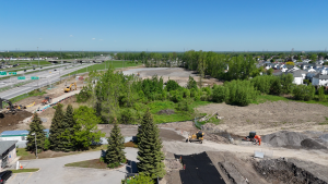 Vue aérienne en direction sud de ce projet de développement industriel à l’angle nord-est de la rue Jacques et de l’autoroute 13.