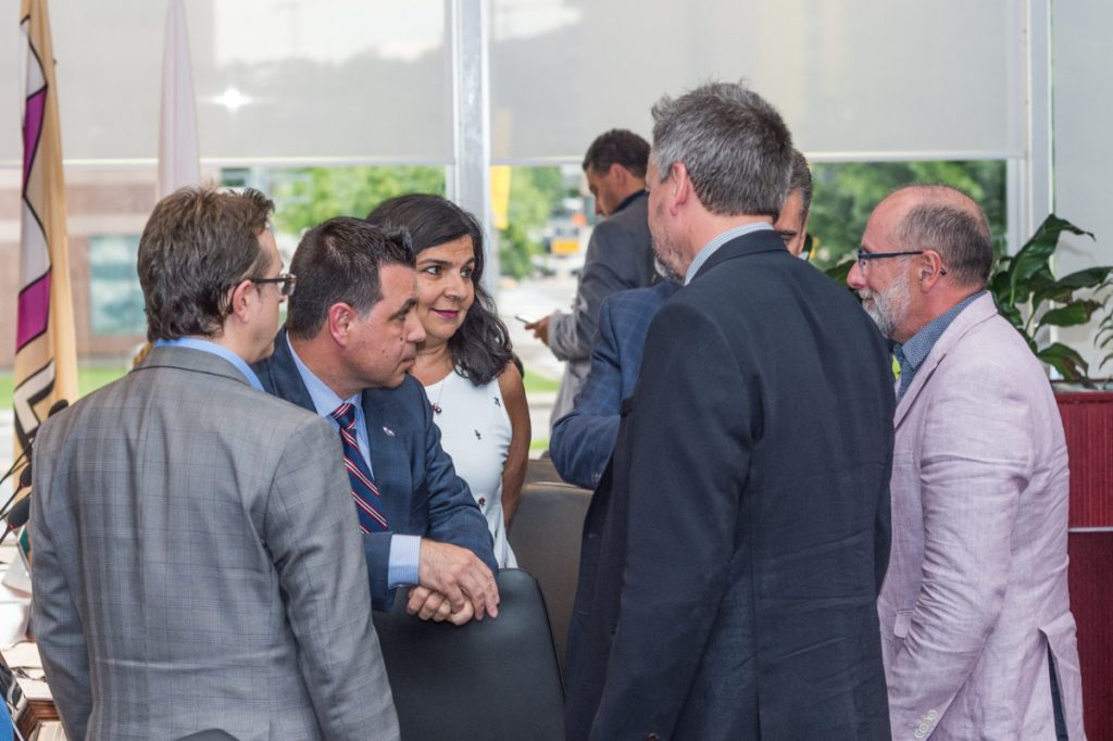 Rare moment de détente lors de la séance extraordinaire convoquée le 20 juin par les élus dissidents du parti au pouvoir et les deux conseillers de l’opposition. Sur la photo, le maire échange avec Ray Khalil, nouvellement nommé au comité exécutif, en présence de Sandra Desmeules, Virginie Dufour et de la présidente du conseil, Christiane Yoakim, après que celle-ci eut ajourné la session pour quelques minutes (Photo 2M.Media – Martin Deland)