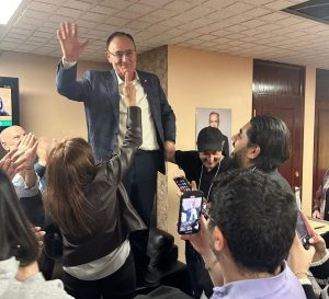 Réélu dans Alfred-Pellan avec la plus forte majorité à Laval, Angelo Iacono célébrant sa victoire avec ses partisans et son fils Gabriel. (Photo 2M.Media – Stéphane St-Amour)